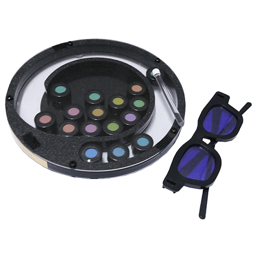 Circular Farnsworth D-15 Colour Test. Test caps are contained in the test unit so they cannot be lost. The patient moves the caps into order using a magnetic wand. Includes test with lid to protect test caps from fading by sunlight, magnetic wand and C-Daylight test goggles.