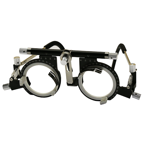 Right and left independent adjustment of PD from 25mm to 40mm (50mm to 80mm overall). Adjustable temple length and flexible ear rest. Nose bridge height and angle are adjustable. Lenses can rotate a full 360°. Can accommodate up to five pairs of 38mm trial lenses. Made in China.